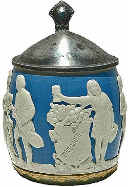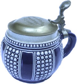 2 litre, Wekara #3480 dispensing stein. This is a copy of Villeroy & Boch - Mettlach #2893. The traditional V&B-M white glazed interior is often included in the Wekara version.