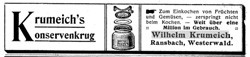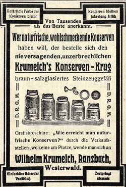 Advert dated 1925. Krumeich's Preserve Jar For use in thickening by boiling of fruits and vegetables - will not break or crack while cooking - well over a million in use. Wilhelm Krumeich, Ransbach, Westerwald. ×