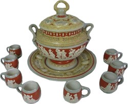 Villeroy & Boch - Mettlach #2087 punch bowl, (soup tureen), with lid and saucer, dated 1916, together with eight Wekara 1/4 litre punch cups, #3487, in matching Terracotta, dated 1926, which were made in Ransbach for Villeroy & Boch - Mettlach, after their great fire in 1921.