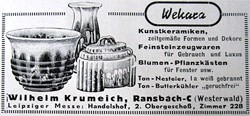 Pre-war Exhibition advertisement: Leipzig messe: Handelshof 2, Obergeschoß, Zimmer 228. Wekara: Kunstkeramiken : Feinsteinzeugwaren: Blumen - Pflanzkästen: Ton - Nesteier & Butterküler ×