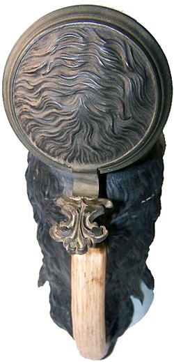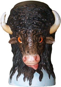 1/2 litre "Bison" (#5827) character stein (ECS74) in bisque porcelain, dated 1890 - 1900. Also available in 1/4 litre. Glass eyes fitted. Decorators painted their initials on the bases and lid inserts on originals, but not later versions.