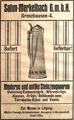 Pre 1936 Advertisement - translated. "Immediately.................Available! Modern and Antique Stoneware Wares Stoneware-storage jars, -warming steins, -jugs, -steins, -bowls, etc., Terracotta-tubs and Vases. (Also) at the Market in Leipzig: Nädler-Passage, Grimmalsche Street -Newmarket, II.Ùbergescholl, Booth 232a".