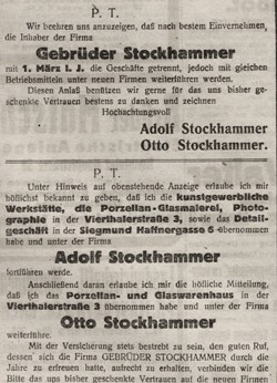 Adolf and Otto moved to Salzburg and opened their business in Vierthalerstraße 3, in 1898. Andreas died in April 1919. Meanwhile on March 1st of the same year Adolf and Otto separated their partnership into two separate entities. Adolf took over production of the arts and crafts workshop, which included the glass and porcelain decoration and the photography for producing transfers, based in Vierthalerstraße 3, together with detail work based in Siegmund Haffnergasse 6. Otto in turn was responsible for sales and the shop area at Vierthalerstraße 3, until his death in November 1934. The company was last listed with Adolf having three employees and two round ovens for curing glazes at the above address, according to the contemporaneous publication: Adressbuch der Keram-Industrie of 1937. Adolf had already died in December 1936. They advertised both day to day and luxury goods for kitchen and household in hotels, cafés, guesthouses and private homes, also photographically decorated porcelain, with workshops in Vierthalerstraße 3, offices in Franz-Josefstraße 26, and shop & showrooms at Sigmund-Haffnergasse 6. Owners still listed as Adolf and Otto Stockhammer. With Adolph dying in 1936, presumably with his business still at Vierthalerstraße 3, It must be assumed that the new owner,