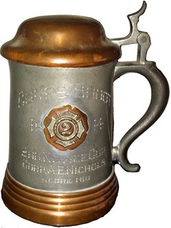 Manning Bowman with lid hinge assembly, typical on the marque. This stein was a prize with the inscription showing it was dedicated for a Boston Militia shooting competition in 1914. The Boston Militia originated from the first militia, mustered in 1629, in Salem, Massachusetts, by Captain John Endicott. It was based on two corps: The first being made up of the sons of the well to do, with the second, consisting of the artisan classes. It went on to form part of the National Guard.